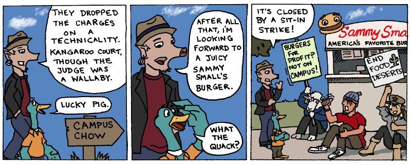 This latest comic is inspired by two anti-business movements in the Sacramento area.  In April, activists petitioned Sacramento’s city council to block a McDonald’s from opening in the midst of what some would term a “food desert.”  This followed on the heels of a January through March sit-in strike that successfully closed the U.C. Davis branch of U.S. Bank.  Both campaigns were driven by a misguided desire to narrow free market choices available to the community.